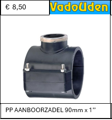 PP aanboorzadel voor PE-leidingen met een buisdiameter van 90mm en een aftakking van 1’’ binnendraad (BSP). Geschikt voor aftakkingen in waterleidingsystemen, beregening en industriële toepassingen. Gemaakt van slagvast polypropyleen, eenvoudig te monteren met RVS bouten en voorzien van een betrouwbare afdichting.