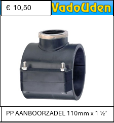 PP aanboorzadel voor PE-leidingen met een buisdiameter van 110mm en een aftakking van 1 ½’’ binnendraad (BSP). Geschikt voor aftakkingen in waterleidingsystemen, beregening en industriële toepassingen. Gemaakt van slagvast polypropyleen, eenvoudig te monteren met RVS bouten en voorzien van een betrouwbare afdichting.